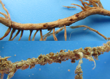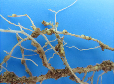 At adult stage, Heterodera glycines produces white or yellow cysts (females) on the roots (figure 3). The most damaged root branchings become brown and necrotic with reduced growth, and finally die. Black brown circles usually remain on dead root particles, they are cysts or small pits and after cysts fall off (figure 4). Symptoms for tobacco plants include slow growth, yellow leaves and tip curl down (figure 2).