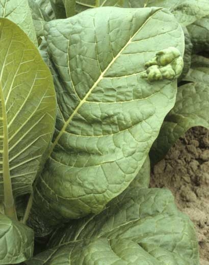 These three genetic abnormalities that occur exceptionally in the field, cause more or less generalised symptoms to all leaves of one or more plants. There are others, whose symptoms can be much more localised. It can be seen in the tobacco plant shown in figure 6, where one can observe a tobacco leaf with an enormous and irregular blister whose origin is also genetic.