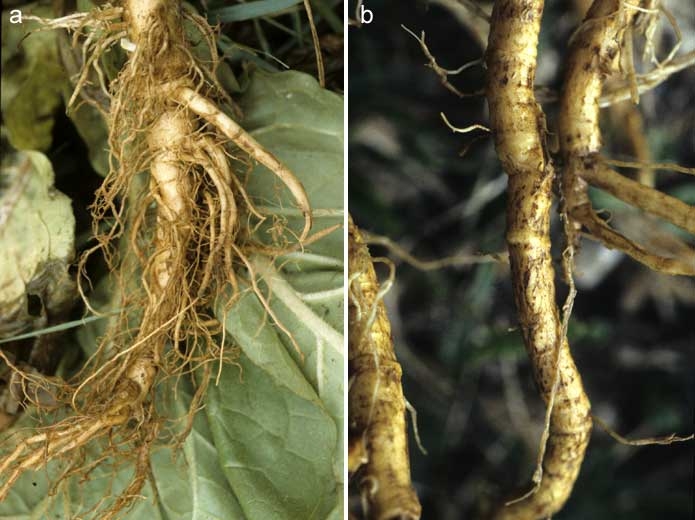 Under certain conditions (heavily contaminated soils, favourable climate ...), the root system of mature plants is invaded externally by the asexual form of T. cucumeris, Rhizoctonia solani. A brown mycelial network is easily distinguished on the surface. Invaded roots turn yellowish to brown, they are superficially corky and many rootlets are decomposed (figure 5).