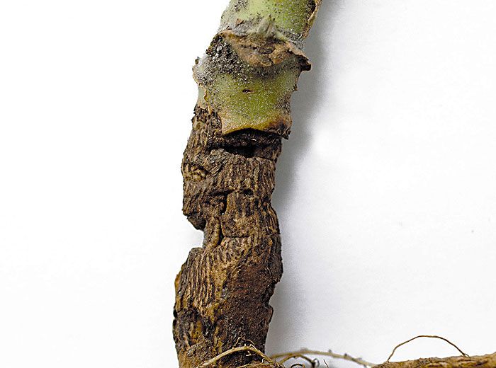 If the contamination or damage is not detected in the nursery and the infected seedlings are planted, a reddish brown canker (figure 3 and 4) occurs within a few weeks of planting. When the canker expands, the affected plants wilt, suddenly turn yellow and dry up.