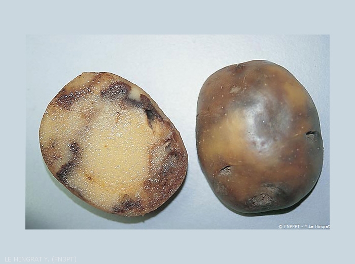 When infected tubers are cut open, they contain areas of rust-coloured mottled flesh just under the epidermis (photo 8), although the decay may extend to the centre of the tuber.