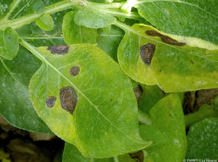 There are clearly delimited necrotic spots, of variable size which are mainly located on the bottom leaves and concentric rings on the larger spots (photos 1 to 3). Symptoms usually appear on the bottom part of the plant where the leaves are older and start senescing (photo 3 to 6)