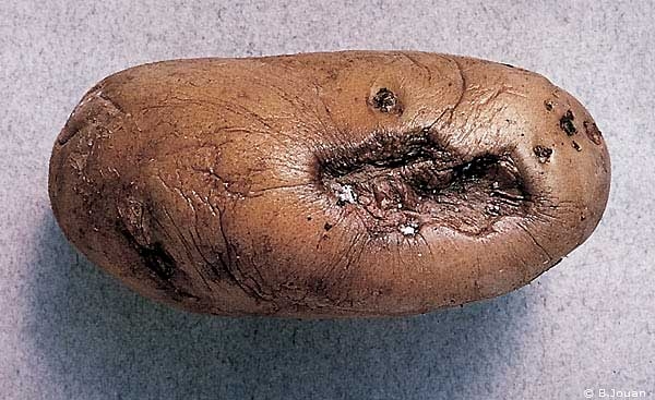 The affected tubers are very dry and depressed (photo 7) and show brown to black superficial rot.