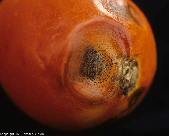 Lesions of limited size and poorly defined, concave and moist outline appear on the fruits initially. They are often located near the stem or in the stem area of the named fruit "shoulder" ( shoulder ) by the Anglo-Saxons (Figures 1 to 3). Subsequently, they gradually spread, and the subcuticular tissues located in their center soon turn brown and then blacken. Note that Alternaria alternata can secondarily colonize the end of the fruit (figure 4), like other species Alternaria , and in particular the lesions caused by the physiological disease called apical necrosis of tomato.