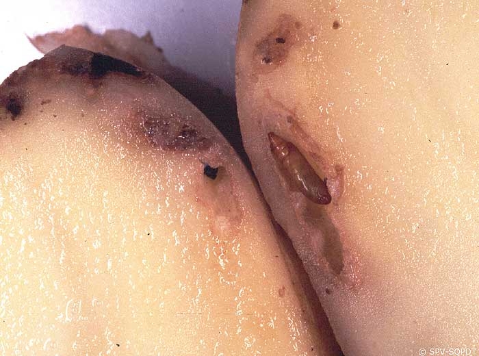 The full-grown larva may pupate in the tuber (photos 5 and 6) but usually leaves the plant to pupate either in the soil or in the storage facilities. The adult tuber moth may emerge a week later, ready for a new generation.