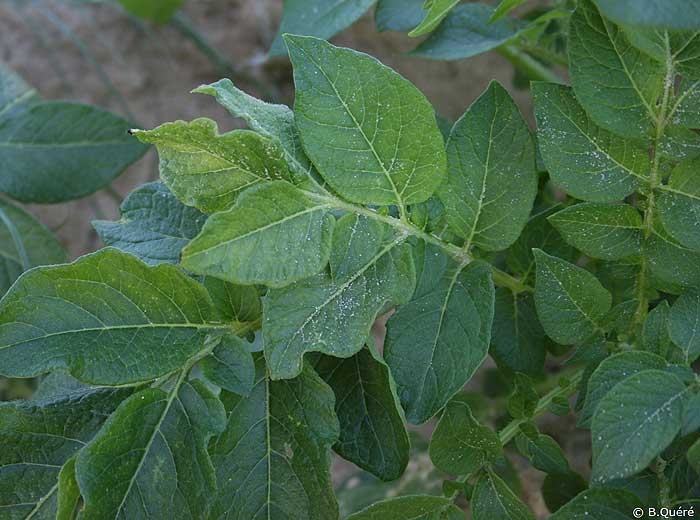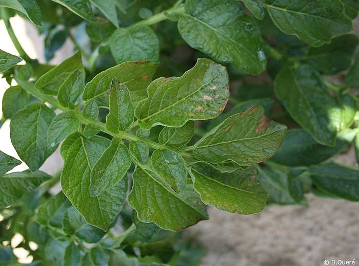 Symptoms of deficiency: the bottom leaves first present mild interveinal, pale-green to yellow chlorosis (photos 1 and 2) which subsequently turn brown and finally become necrotic (photos 3 to 5). Such lesions are not unusual on potato plants, during the last part of the growing season, particularly on some cultivars. Lesions are typically located on the central part of the leaflets, except on the veins of the older leaves (as magnesium is highly mobile in the plant).