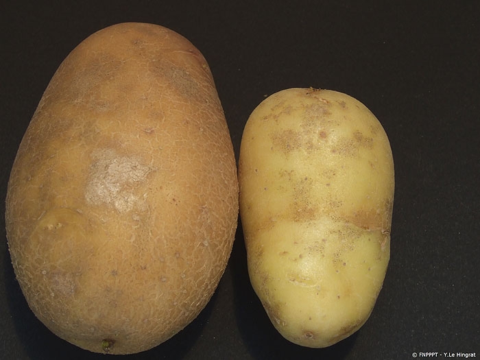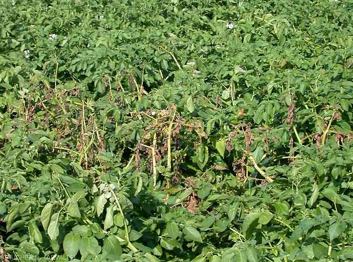 The typical symptom is premature death of the haulms with drying of the foliage extending from the top to the bottom of the plant: the leaves turn yellow and curl upwards (photo 1). These symptoms are similar to those of Verticillium wilt.