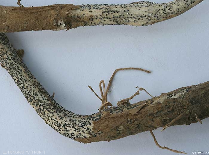 At the end of the growing season, the base of the stems and the underground parts of the plant display signs of typical infection: early destruction of the roots, detachment of the root envelope and numerous black dots on the base of the stem (microsclerotia) (photo 2).