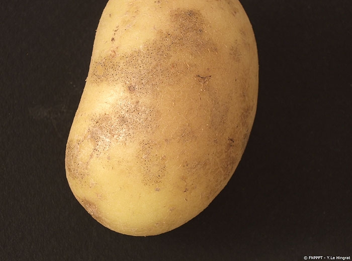 Lesions on tubers caused by fungal infection can be observed (photos 3 and 4): irregular and diffuse light to dark greyish surface areas with or without the formation of fructifications (microsclerotia) with setae when tubers are exposed to moisture (photos 5 and 6). Fructifications due to black dot (microsclerotia) are larger than for silver scurf (conidiophores) (photo 7).