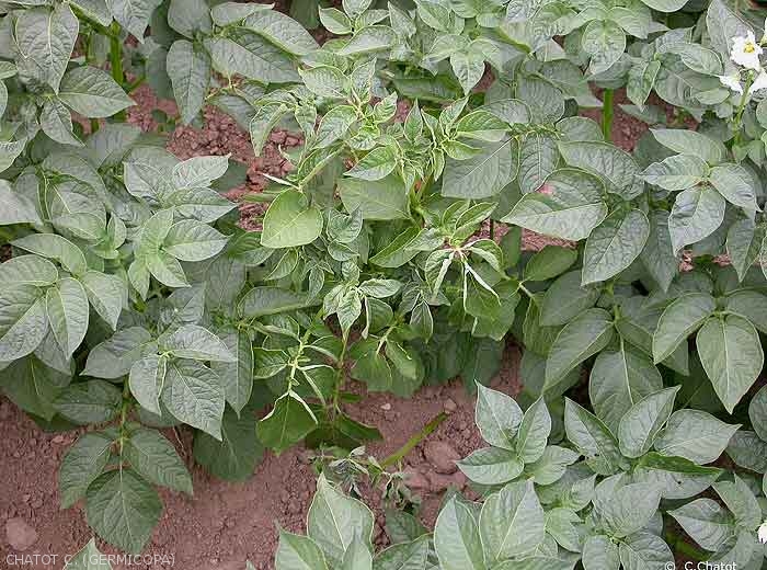 Later, and resulting from the infection at the stem base, altering the sap movement, a typical symptom on the aerial part of the affected plant (photos 5 and 6) consists of: leaf roll, purplish edges on the leaves and yellowing (sometimes wilting) of the foliage