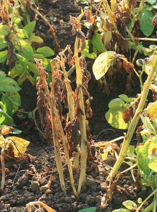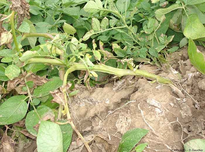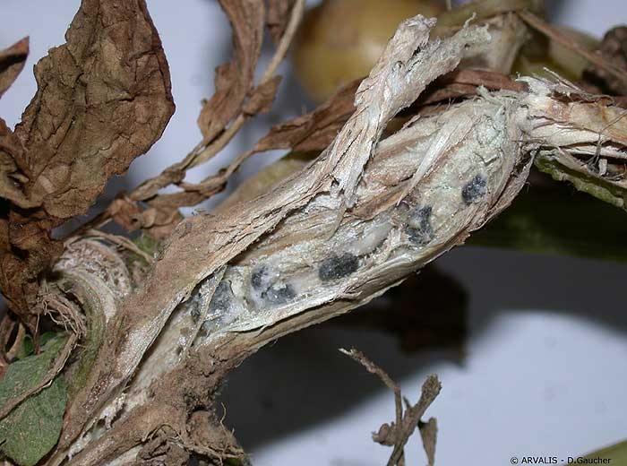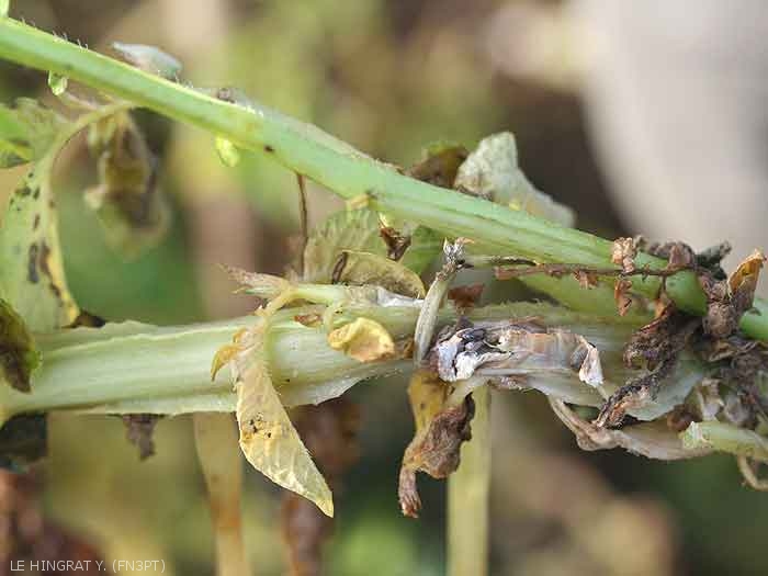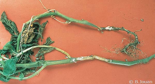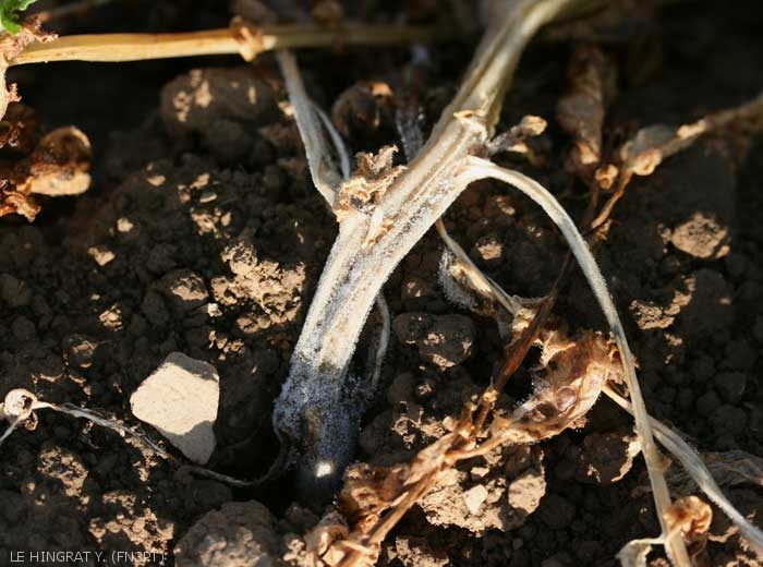 In growing crops, the symptoms appear after long periods of rain and are characterised by a whitish mould on the lower part of the stems and at the leaf axils. The tissues are gradually destroyed and the diseased stems fold, wilt and fade (photos 1 to 5), and finally, in the case of early and severe soil infestation, the plants may die.