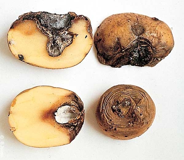 When cut in half, the tuber reveals a brown rot which develops into the flesh, with an unclear limit between healthy and infected areas, and with the potential presence of internal cavities covered with mycelium (photos 3 and 4). The tuber may dry out gradually, eventually becoming hard and mummified.