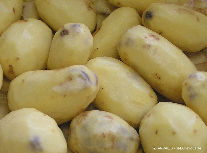 Thus the symptom usually appears 1 to 3 days after the cell damage, hence the impossibility of detecting it during handling operations. Placing the tubers at high and humid temperature accelerates the biochemical reactions and the symptoms will be revealed on peeling the tubers around twelve hours after the impact.