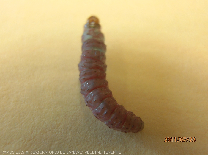 The adult is a small dark to light brown moth (photo 1) with a wingspan of 15-22 mm and the larval stage (photo 2) is the most devastating (photos 3 and 4).