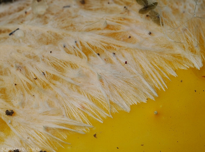 Conservation : persists for several years rather on the surface of the soil on plant debris, in the form of aggregated mycelium ( figures 1 and 2 ), but especially of sclerotia (figures 3 to 6) free or or associated with plant debris. This fungus is also able to survive on different organic substrates.