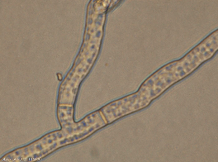 - Dissemination : by basidiospores carried by wind and air currents over fairly long distances. Transmission is also ensured by soil contaminated by mycelium and sclerotia, tillage, soiled agricultural tools and machinery, plants produced in infested nurseries.