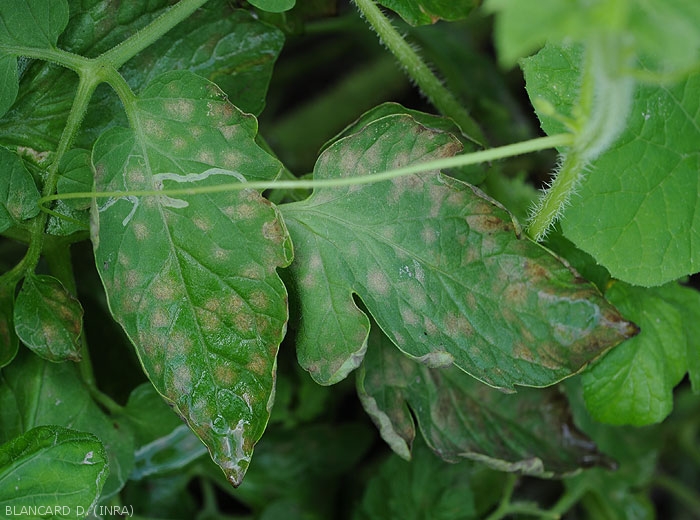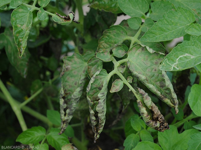 The extension of the spots and their confluence can lead to the necrosis and drying out of more or less leaflets and leaves (figure 3) which will remain in place on the plants.