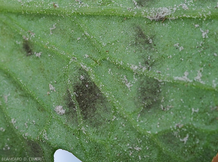 Signs : a sporiferous down that is initially white, gradually turning black as sporulation progresses, covers the lesions (figure 4). This is made up of more or less brown, partitioned conidiophores bearing subhyaline conidia with several partitions.
