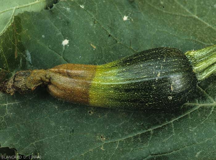 Initially limited, moist and dark lesions on fruit starting from more or less senescent floral parts, especially in the stylar zone. Irregular in shape, they spread and gradually darken the flesh (figures 4 and 5).