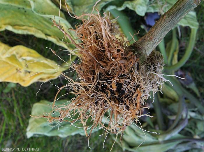 - Browning and root rot in soil and above ground ( root rot ) (figures 1 to 5) sometimes localized at the end of the roots. Browning, decomposition and disappearance of rootlets and small diameter roots. The cortex of the main roots and taproot also ends up rotting more or less locally. The vascular tissues facing the altered areas end up turning brown.