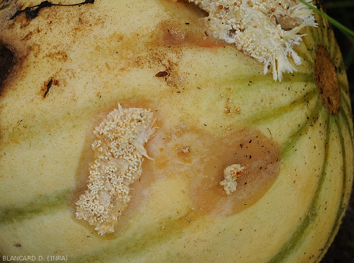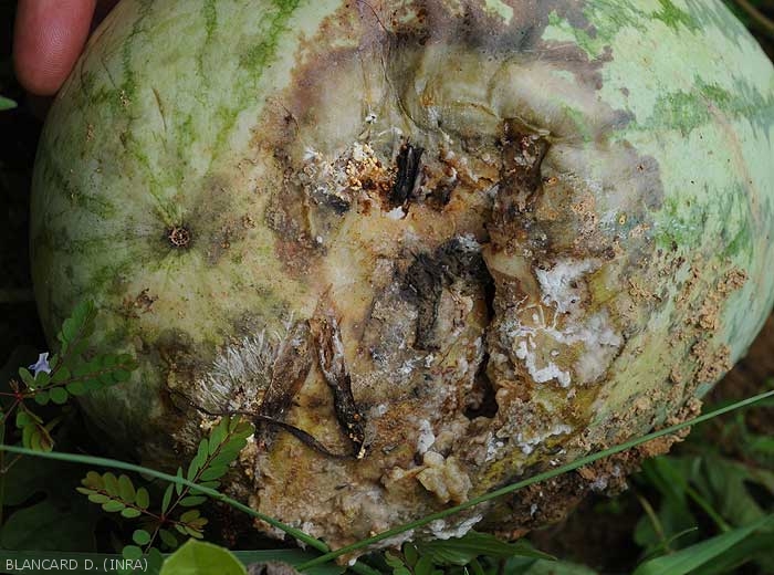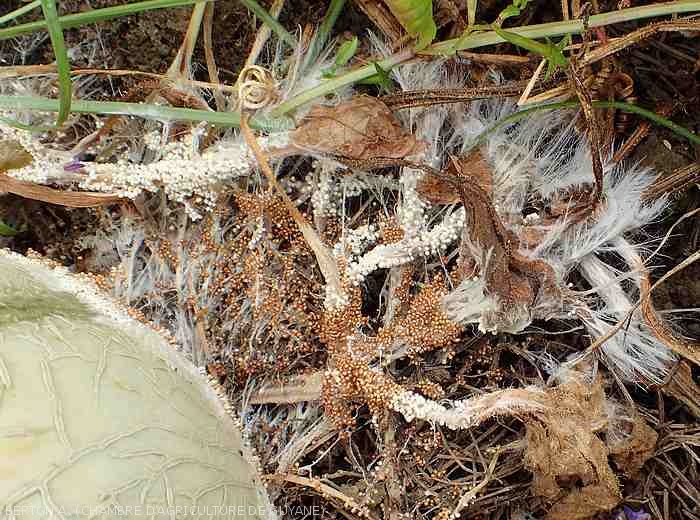 Sclerotium rolfsii attacks all organs of Cucurbitaceae located in or near the soil, whether the plants are very young (in nurseries) or adult in the field.