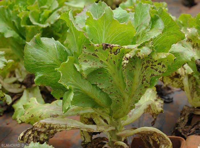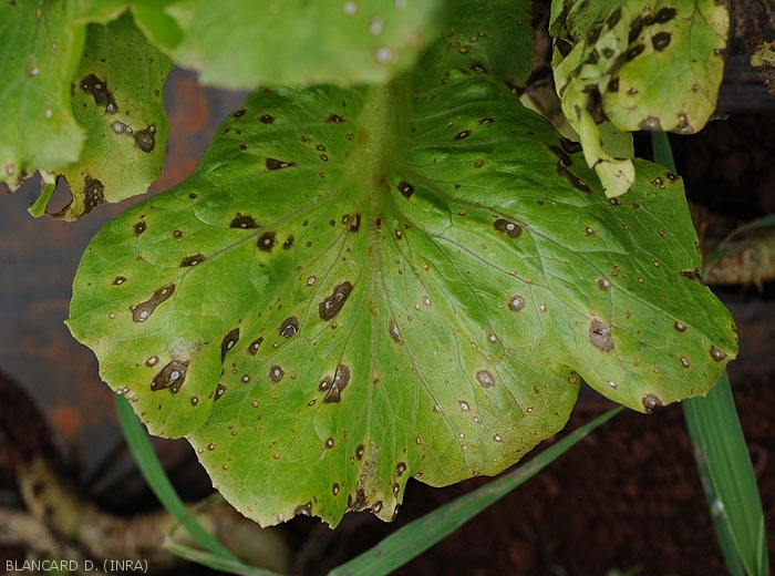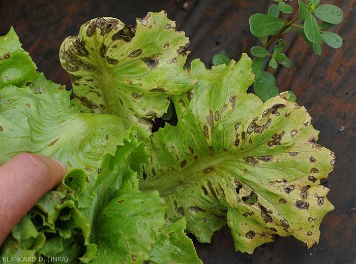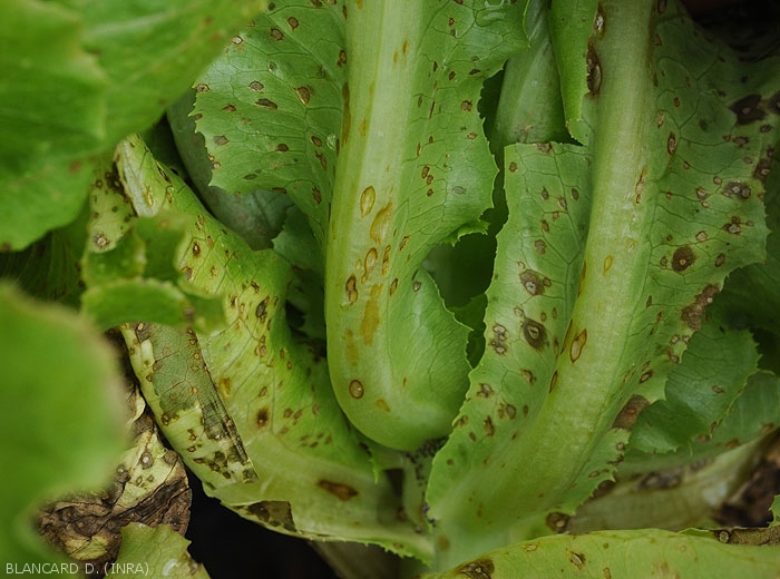 Subsequently, the spots spread and form brown lesions sometimes circumscribed by the veins.
