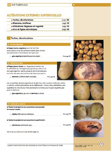The aim of this guide, developped by a panel of potato experts, is to offer to a wide audience – producers, technicians, advisors, researchers, students and individuals – practical and accurate information on the main diseases, pests and disorders of the potato (photo 1). This guide offers a practical key (photo 2) to the easy identification of the major symptoms observed on potato crops and at harvest and then data sheets (photo 3) of potato diseases, pests and disorders.