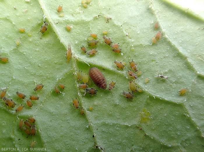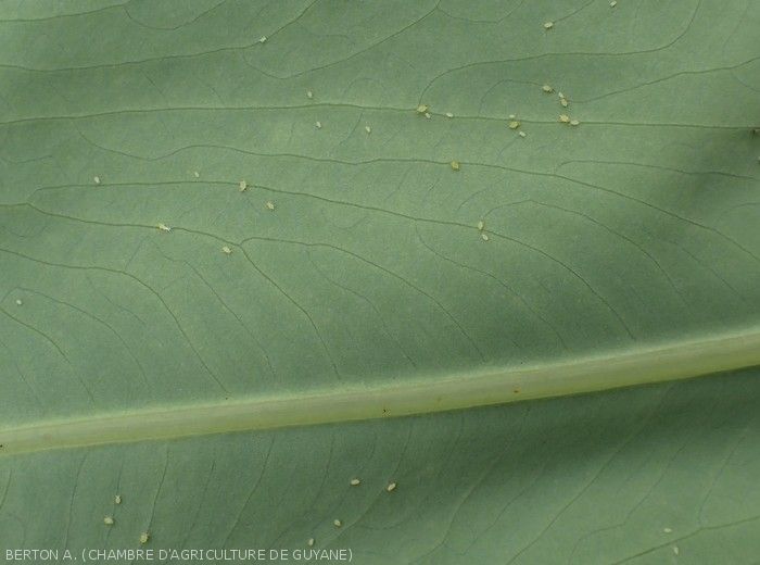 - Larvae and adults often present on the underside of the blade, feeding through their rostrum. The excess sugar contained in the sap is released in the form of honeydew.