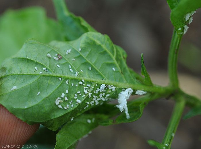 - Presence of honeydew and subsequently Fumagine covering the surface of the affected aerial organs (figures).