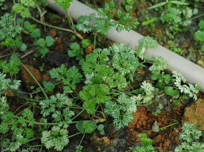 - Affected leaves and leaflets tend to become chlorotic and dull.