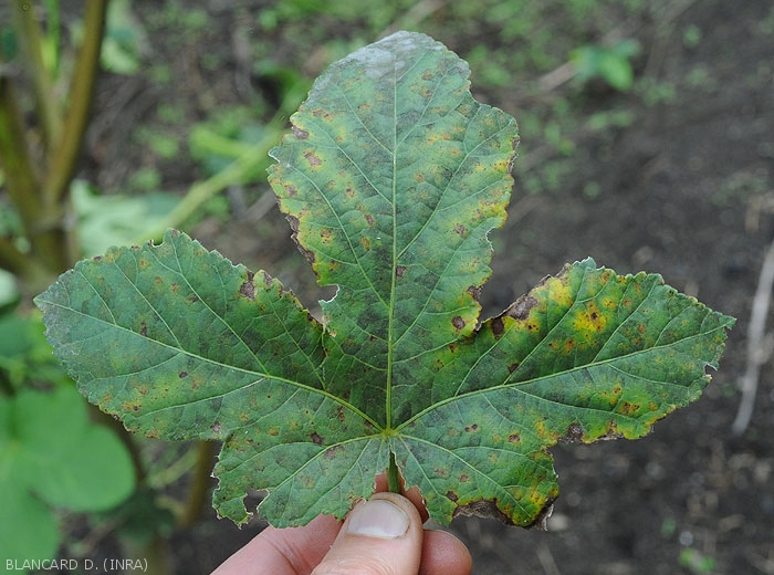Subsequently, the spots spread and form blackish lesions often delimited by the veins (figures 2 to 4).