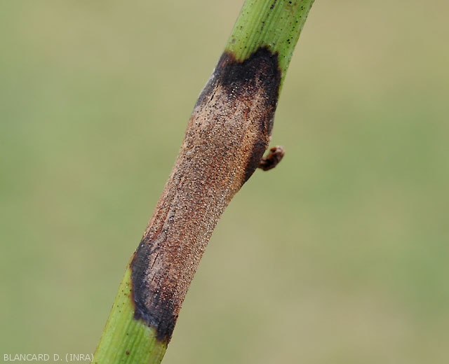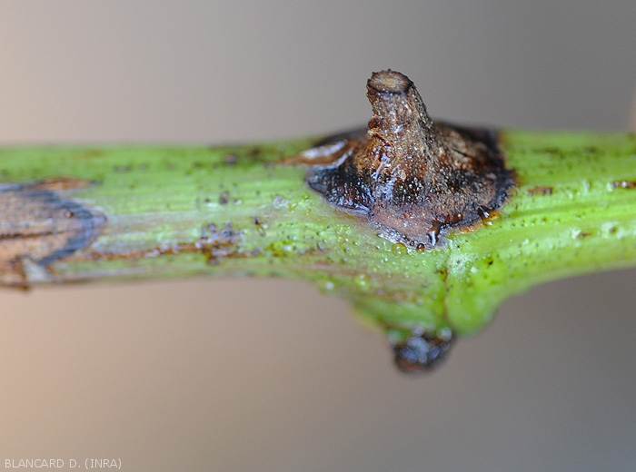 - Lesions on pedicels and twigs are more or less elongated and depressed, brownish in color; affected tissues at the periphery are dark brown to blackish (Figures 10 to 17). The alterations can also be canker, surrounded by bands of scar tissue causing the bark to burst into rather characteristic strips (Figures 10, 11, 15 and 16). Note that the alterations on green shoots are localized around the nodes (figures 12, 13 and 16).