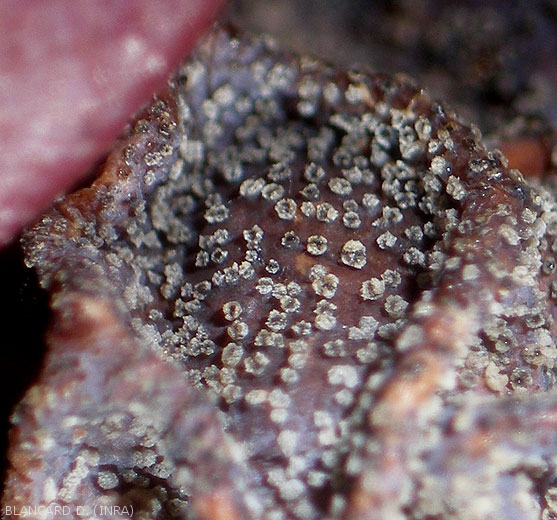 - Symptoms on berries appear before and after veraison. Before veraison, the berries take on a livid hue, pinkish beige to purplish beige; the phenomenon entirely affects the berries which gradually wilt (Figures 1 to 6). Small protuberances appear on the surface of the berries: pycnidia of the fungus (Figures 7 to 9 and 17). Quite quickly, the berries shrivel up and dry out (Figures 2 to 8). Some of them fall to the ground while others remain attached to the stalk (figure 4). The whitish color of the berries is due to a peeling of the skin of the epidermal tissues following the parasitism of P. diplodiella . This fungus can also reach the pedicels and then invade the stalk, sometimes causing wilting and partial drying of the bunch (Figure 3).