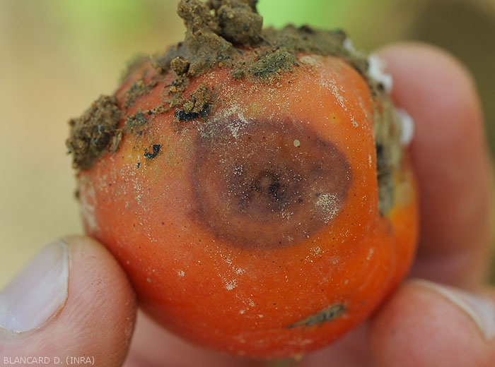Small, moist, dull circular lesions, light brown, progressively developing on fruit. As they extend, they become concave and their center gradually browns (figures 1 to 3)