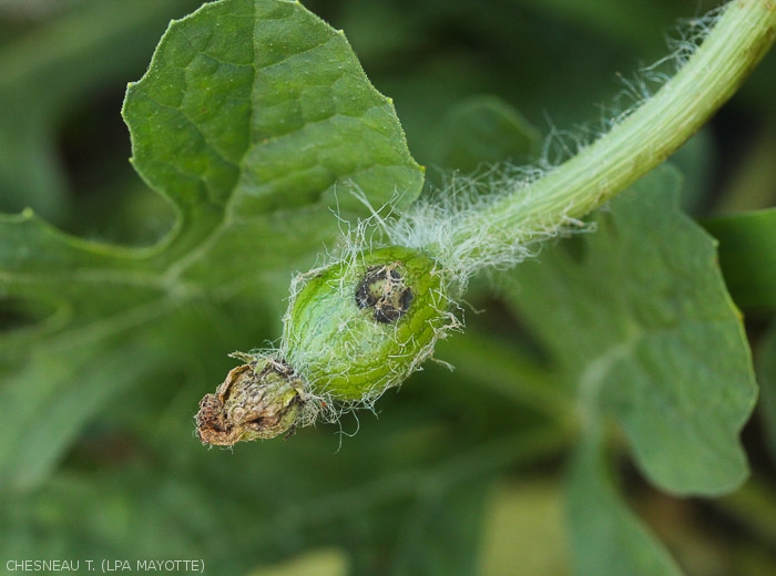 - Rotting and decomposition of fruits linked to the development of opportunistic micro-organisms penetrating them via the egg-laying holes (bites).