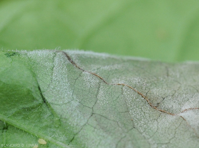 Signs : presence of a discreet and fleeting white down on the underside of the leaf blade (figure 7); this is made up of the sporocystophores and sporocysts of P. infestans.
