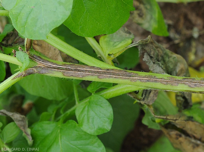 Browning of the apices (figure 5) and brown cankered lesions on stems and petioles, more or less extensive, and with an irregular outline (figure 6).