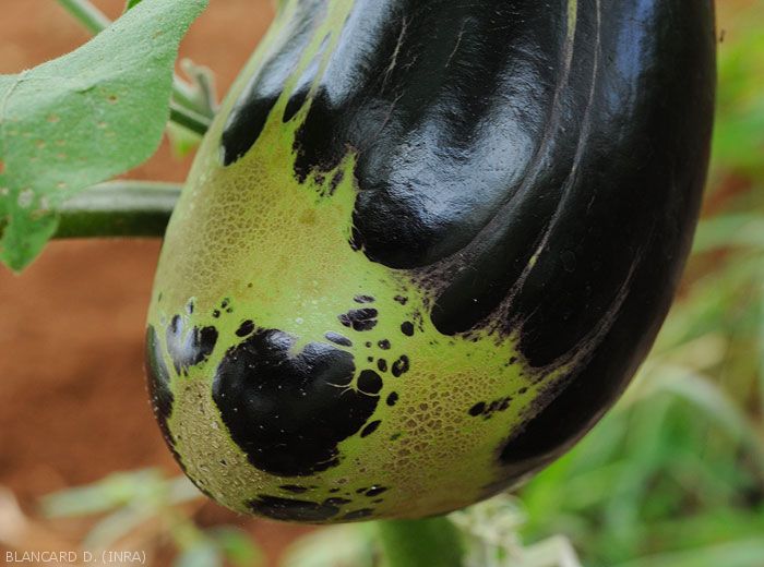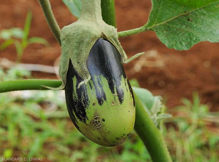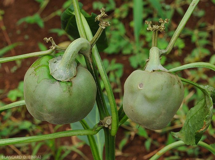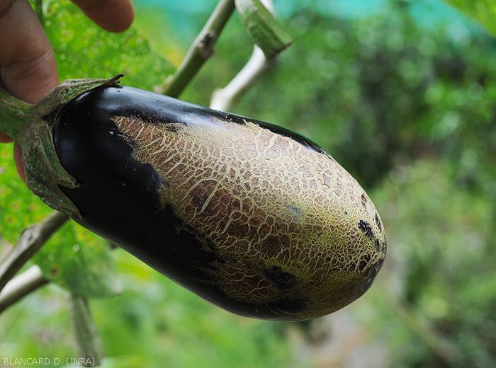 Areas of brownish or corky tissue appear under the leaves, on the petioles or sepals, but especially on the fruits (figures 6 and 7 - pepper) (figures 11 to 13 - eggplant).