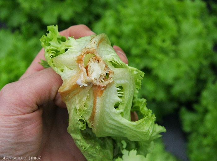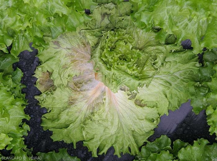 Petioles and main veins as well as the collar are invaded, which leads to chlorosis and wilting of the outer leaves (figure 4), then of the plants.