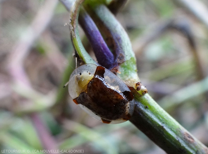 Species encountered: Aspidimorpha quinqefasciata (Fabricius, 1801) which is most frequent on sweet potato, A. aurata (Montrouzier, 1855), A. convolvuli (Boheman, 1862) endemic to New Caledonia. A. quinquefasciata shows a colored crest on the top of its shell which is bordered by translucent patches, and brown-brown to black in color (sexual polymorphism). Native to equatorial Africa, we find this species in Réunion, Madagascar and New Caledonia where it was introduced in 2008. It only moves during the day and remains on the upper surface of the leaves, while the larvae s' observe under the leaves.
