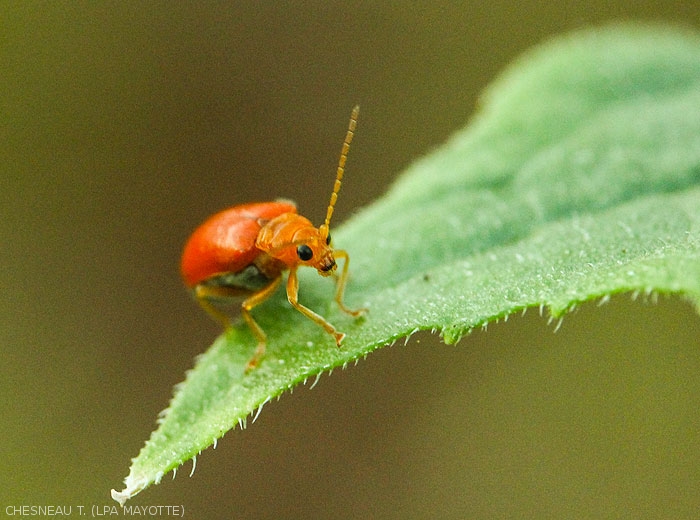 Insect present in many parts of the world (mainly in Africa and Asia) which causes extensive damage to Cucurbitaceae crops in Mayotte. Uniformly orange in color, it belongs to the Galerucinea subfamily.