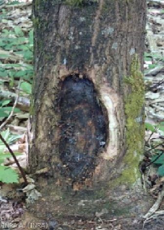 The fungus develops on the bark of young stems or coppice strands as elongated cortical spots at the base of the stems, corresponding to necrosis of the underlying cambial zone (Figure 1). The bark becomes brownish, cracks and eventually peels off, leaving the wood bare. Depending on the case, the tree's defences are overpowered by the pathogen, which can then girdle the stem and cause it to dry out, or the tree produces successive scarring beads in response to the attack, giving a perennial canker (Figure 2). Propagation occurs from strand to strand in a coppice stand.