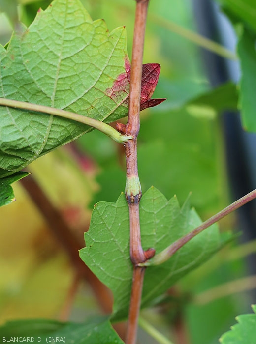 The formation of a black scar bead (figure 1) due to the reaction of the cambium to the oviposition stings results in the "redness" of the end of the branch, because of the disruption of the phloem flow from the leaves to the vine (figures 2 to 7). The leaves can also curl around the edges which, on red grape varieties, recall symptoms of flavescence dorée.