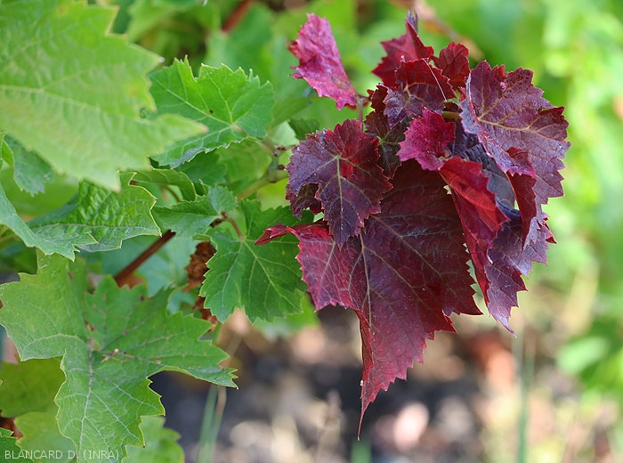All the grape varieties do not seem to react in the same way to egg-laying bites, where the reddening is more or less marked. Apart from the vine, many plant species can be parasitized by the hartebeest leafhopper, fruit trees such as apple or plum , walnut and hazel, as well as ornamental shrubs or conifers (poplar, lime, dogwood, oak, lilac, etc.) and market garden plants.