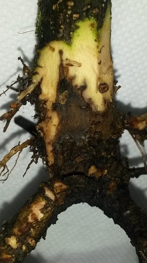 When the pathogen has caused severe root damage, this damage extends into the base of the trunk (the collar, Figures 2 and 3). Black discharges flow from cracks in the bark covering the infected parts of the crown. When the bark is stripped, the cortical tissues and bare wood are coloured brown, whereas under the bark in the uninfected area they are pearly white (Figures 4 and 5). These necrotic tissues are the tissues invaded by the pathogen.