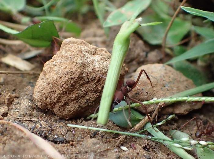 Even today, the cassava ant is considered one of the most formidable crop pests (if not the most feared) in French Guiana. Cassava ants are active throughout the year. The damage is therefore visible at all climatic periods.