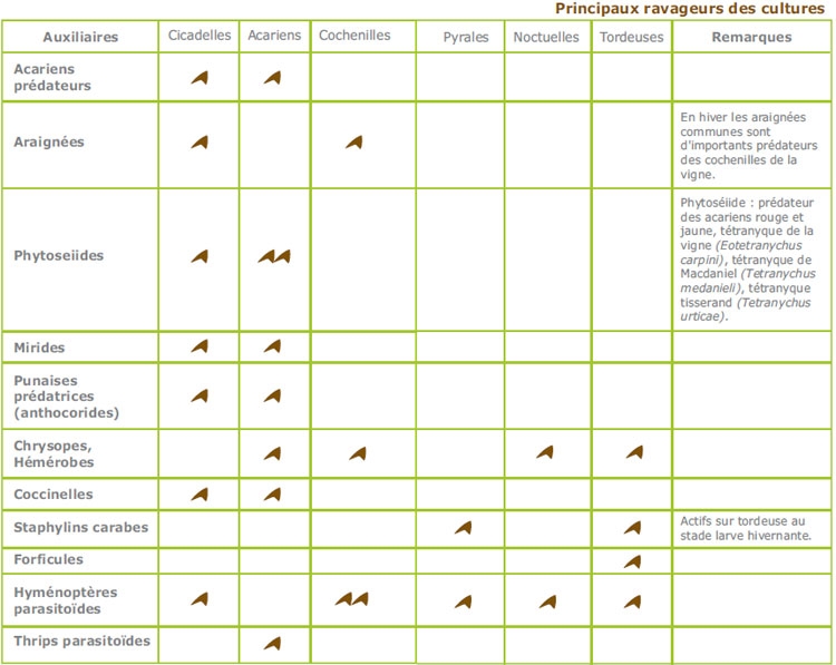 This section is largely inspired by the collective work edited by G. Sentenac (IFV), Auxiliary fauna of the vineyards of France , Eds France Agricole-Dunod, 2011.