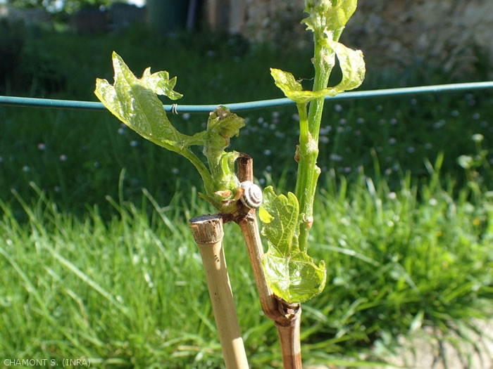 These gastropods are polyphagous, nocturnal, hibernating on the ground then climbing on the vines as soon as the temperatures warm, especially if the spring is wet (figure 1). These pests will then consume the young shoots during bud break (figure 2). On older leaves, snails attack the leaf blades but leave the veins. The damage can be significant during the rainy season. The protective sleeves for young vines promote their concentration.