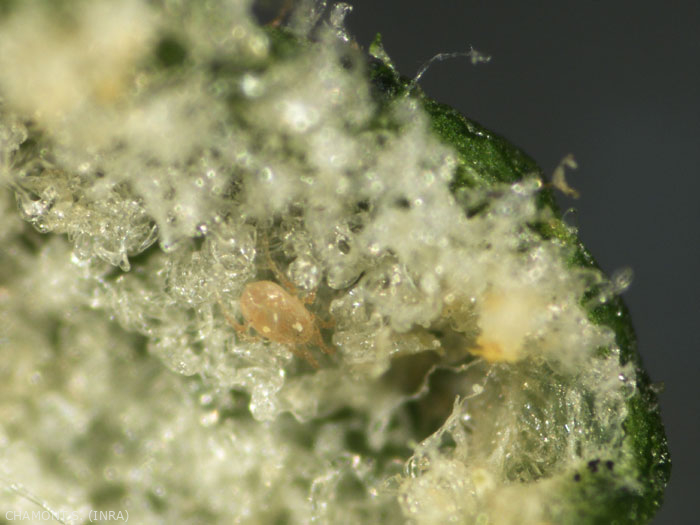 The Phytoseiidae are between 300 for the majority and 500 µm (1/2 mm) long. Their body is divided into 2 regions: the gnathosoma (part of the body which carries the mouth parts and sensory organs attached to the mouth but not the brain) and the idiosoma (the rest of the body to which the 4 pairs of legs are attached. ). The idiosoma has thickened parts (or shields or plates = chitinous cuticle called thickened exokeleton), a single dorsal shield and three ventral shields. Identification with the species of Phytoseiidae is essential for use in biological control, each species having different biological characteristics. Polytomous keys (of Phytoseiidae species on grapevines in Europe and species with agronomic interests in the world) are available free of charge on the UMR CBGP website.