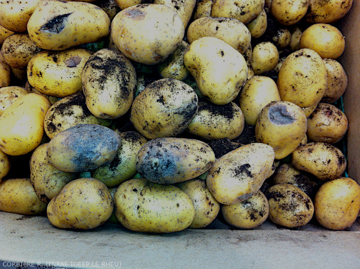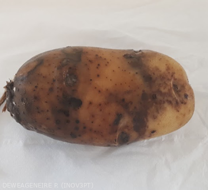 On tubers, the disease manifests itself as irregular lesions, brown to violaceous on the outer side and rusty on the inside (Figures 10-11) These lesions cause tubers to rot, and make them unmarketable and unfit for consumption. They also often serve as entry points for secondary infections by other pathogens, fungal or bacterial, which can spread within and between tubers during storage.